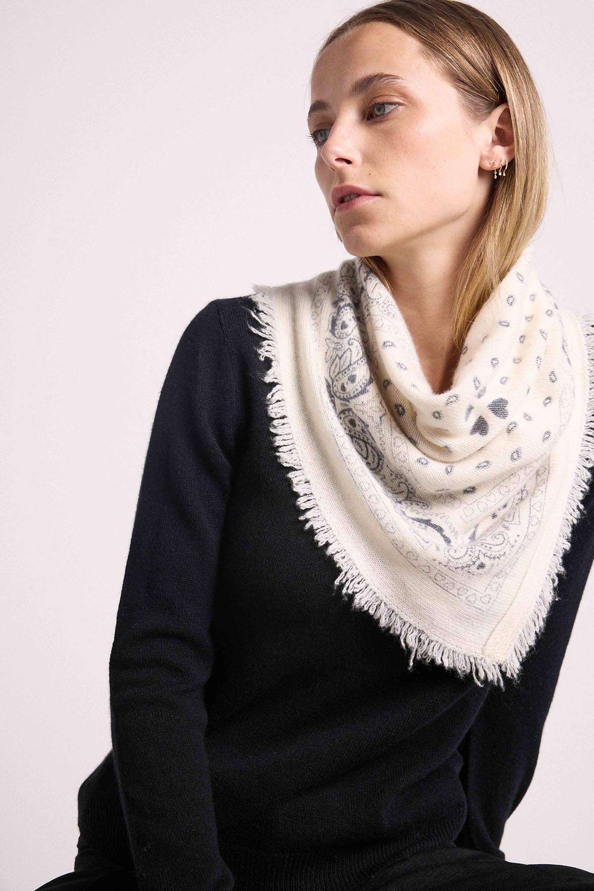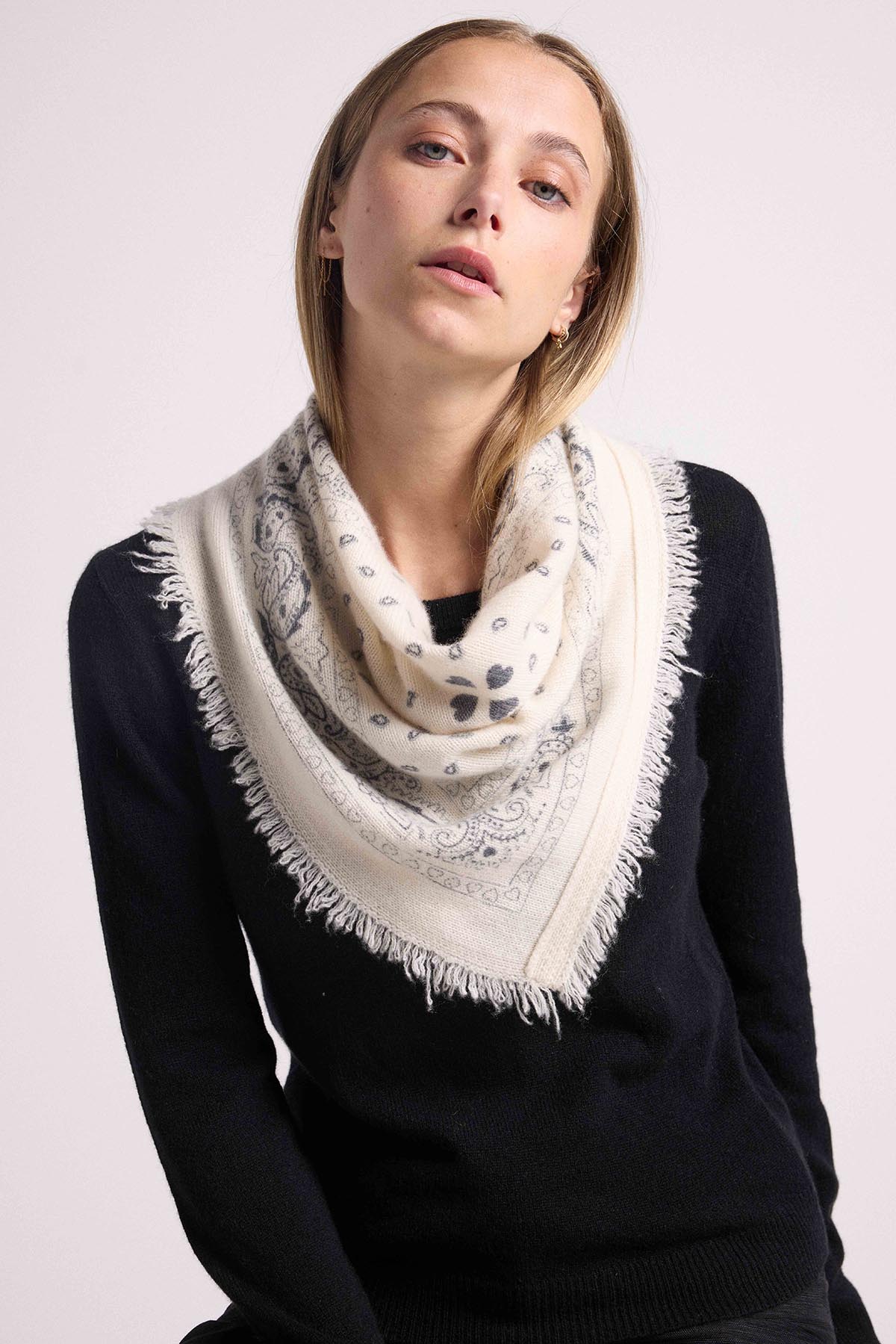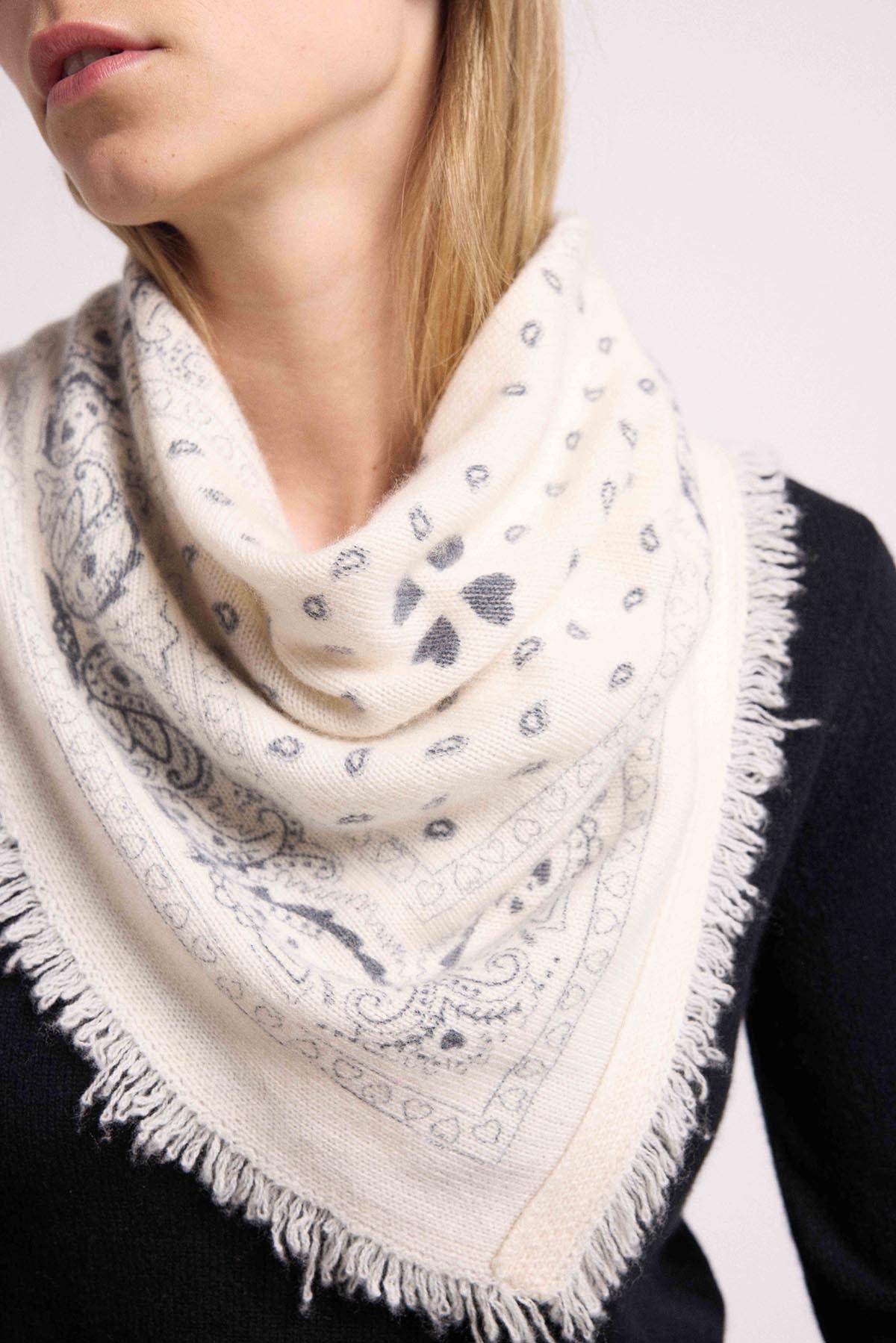 Maison Héritage propose une nouvelle version de son écharpe iconique Irma, réinterprétant le traditionnel bandana dans une version sophistiquée en 100% cachemire, autour d’une ode à l’amour de coeurs. Cette écharpe est à porter nouée sur un pull ou sur une veste, idéal à associer avec notre veste trompe l’oeil Denim Cachemire Jade.