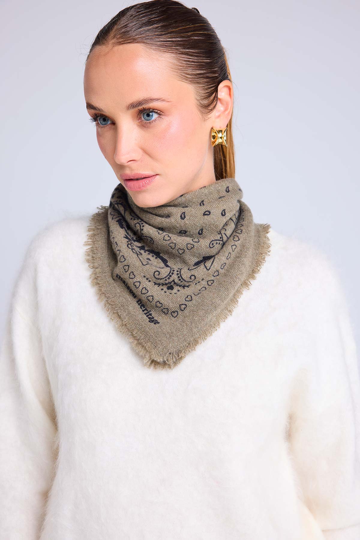 Maison Héritage propose une nouvelle version de son écharpe iconique, réinterprétant le traditionnel bandana dans une version sophistiquée en 100% cachemire, autour d’une ode à l’amour de coeurs. Cette écharpe est à porter nouée sur un pull ou sur une veste, idéal à associer avec notre veste trompe l’oeil Denim Cachemire Jade.