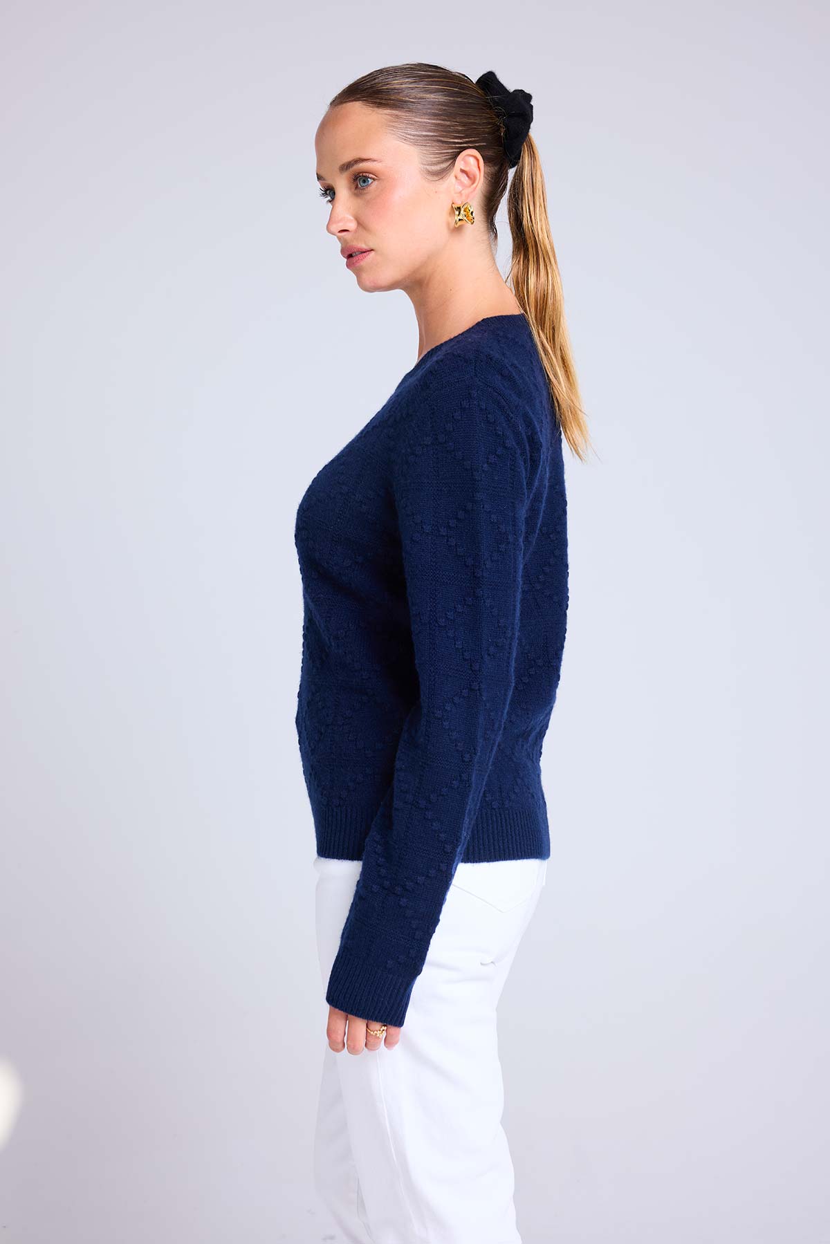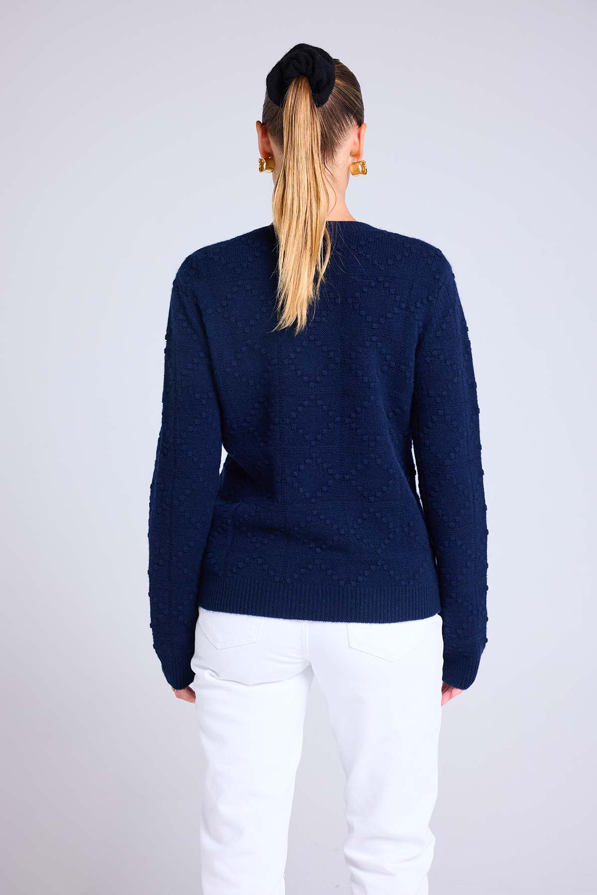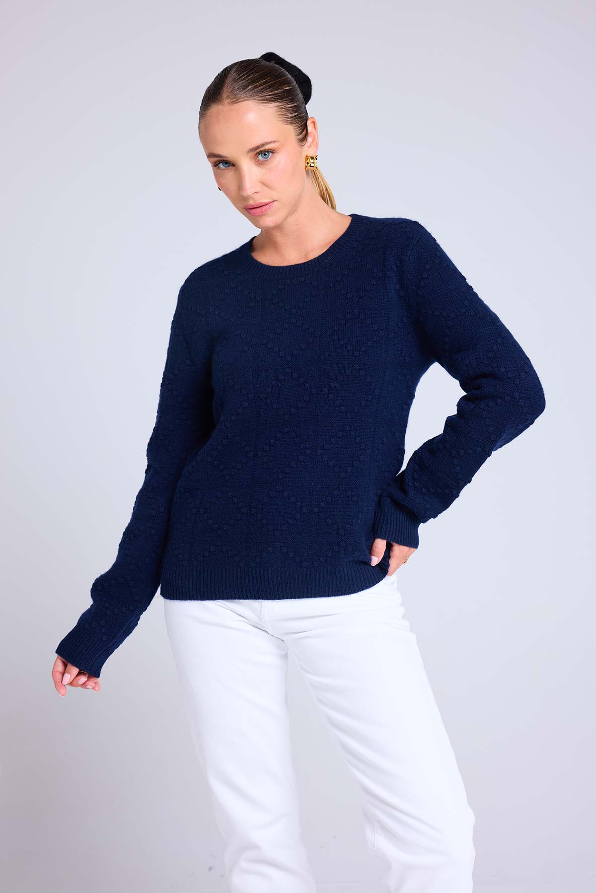 BLAIR se distingue par sa texture unique en petites boules de cachemire qui apportent relief et personnalité à la pièce.