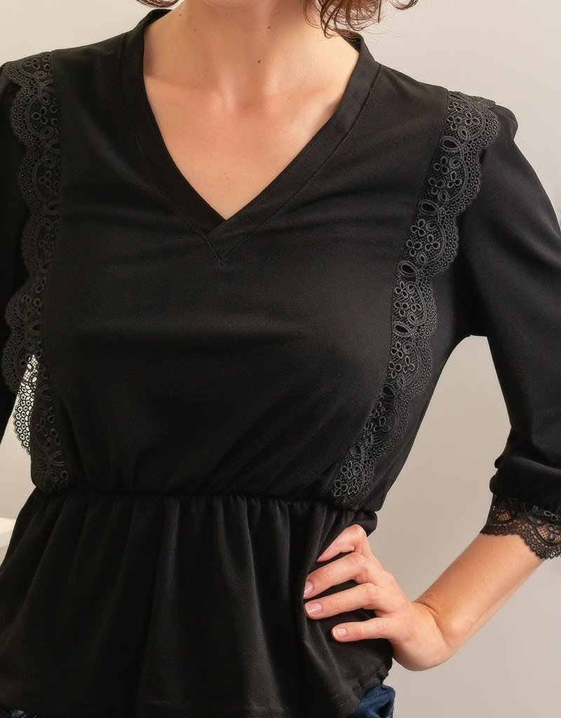 Cette magnifique blouse en voile noir apportera une touche de glamour et d’élégance a toutes tes tenues ! Les volants sur le devant ajoutent une nuance de féminité et de charme, tandis que la taille élastique assure un confort maximum. Les manches 3/4, quant à elles, donnent une allure tendance et les manches froncées ajoutent une dose de chic supplémentaire. Une pièce incontournable de ta garde-robe pour être à la fois stylée et à l’aise en toutes circonstances !