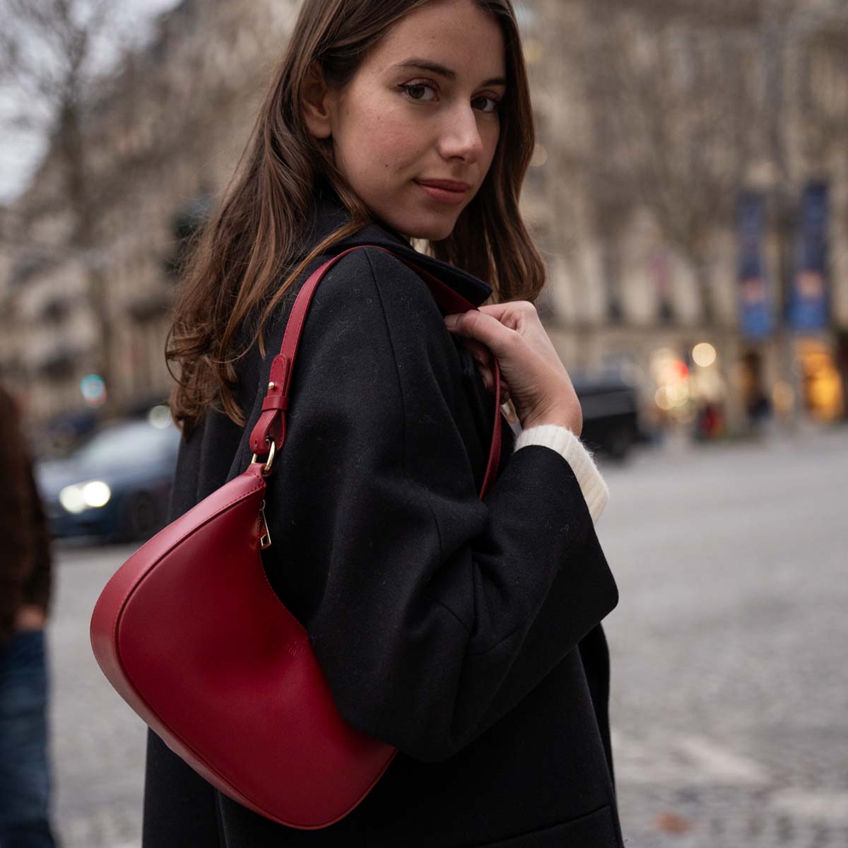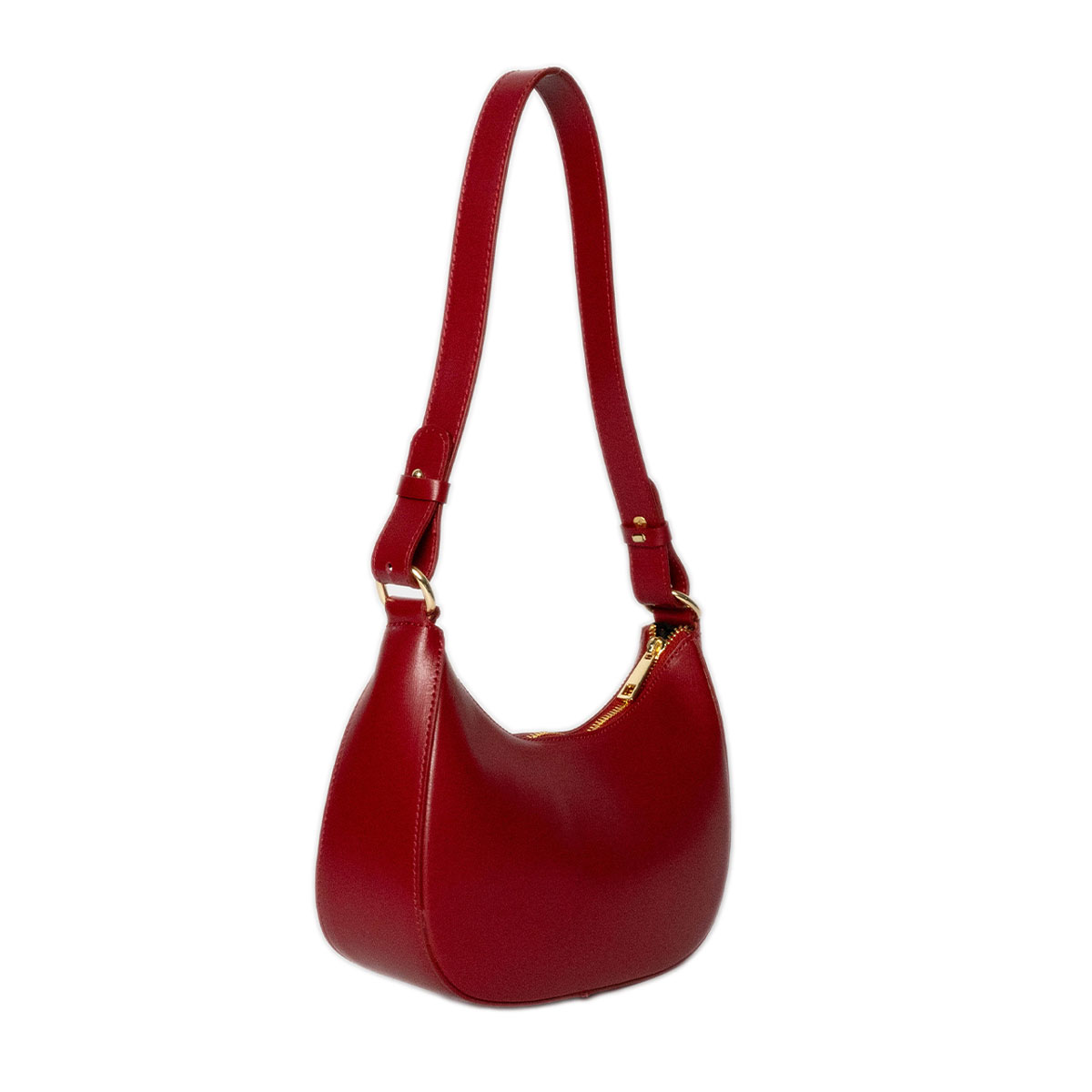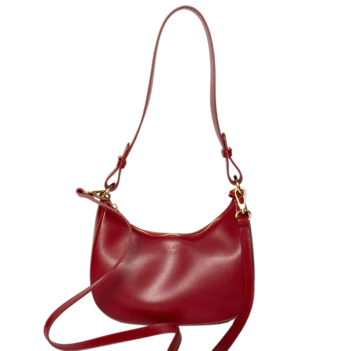 Sac à épaule en cuir avec poche intérieure zippée, poche frontale, fermeture principale à glissière et bandoulière amovible.