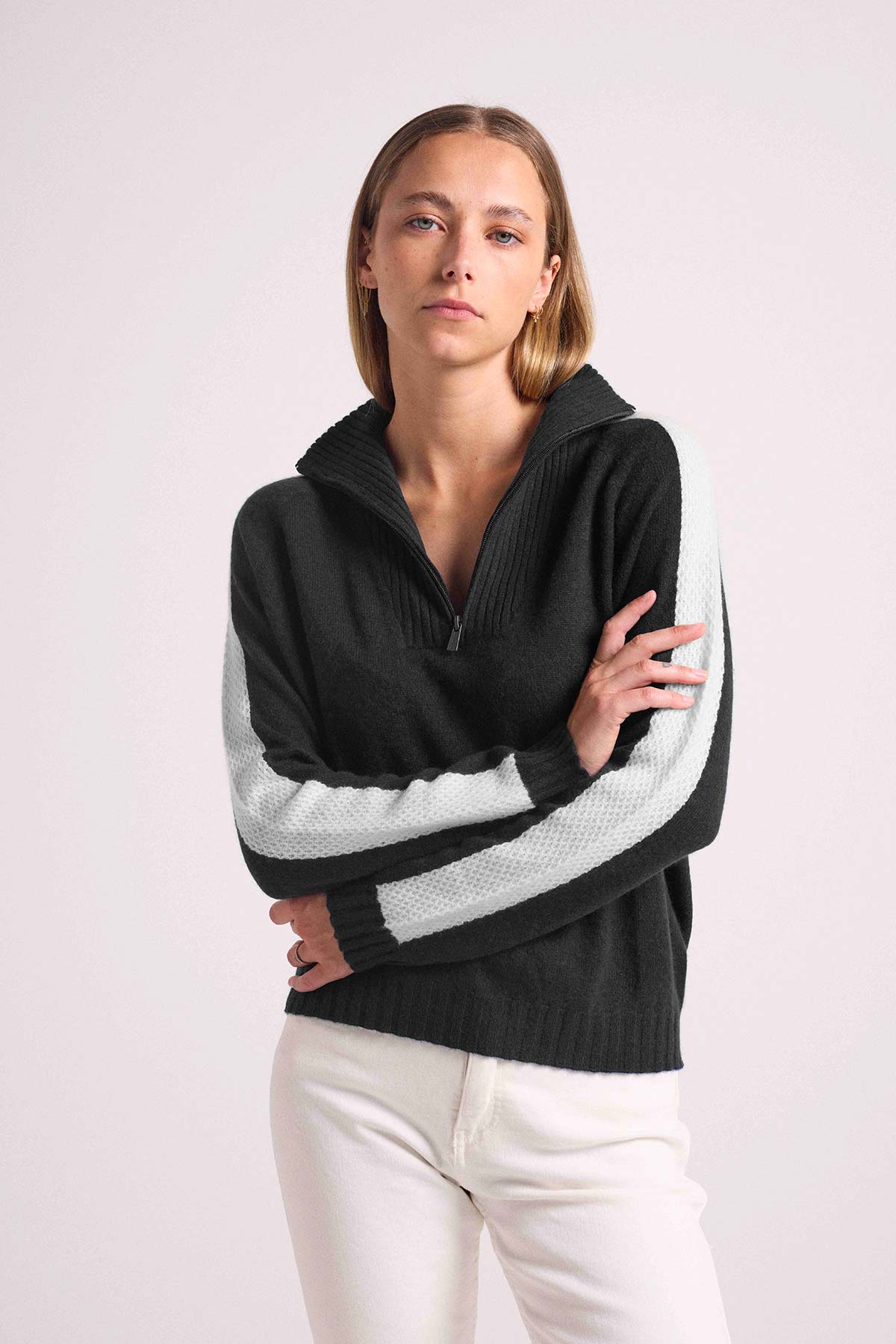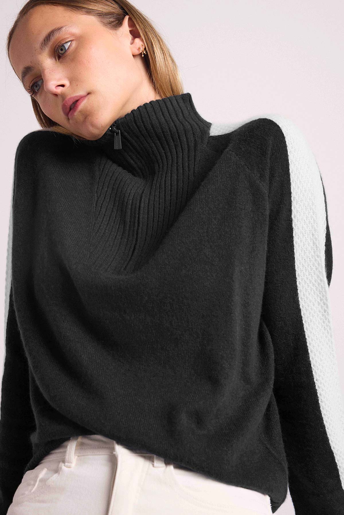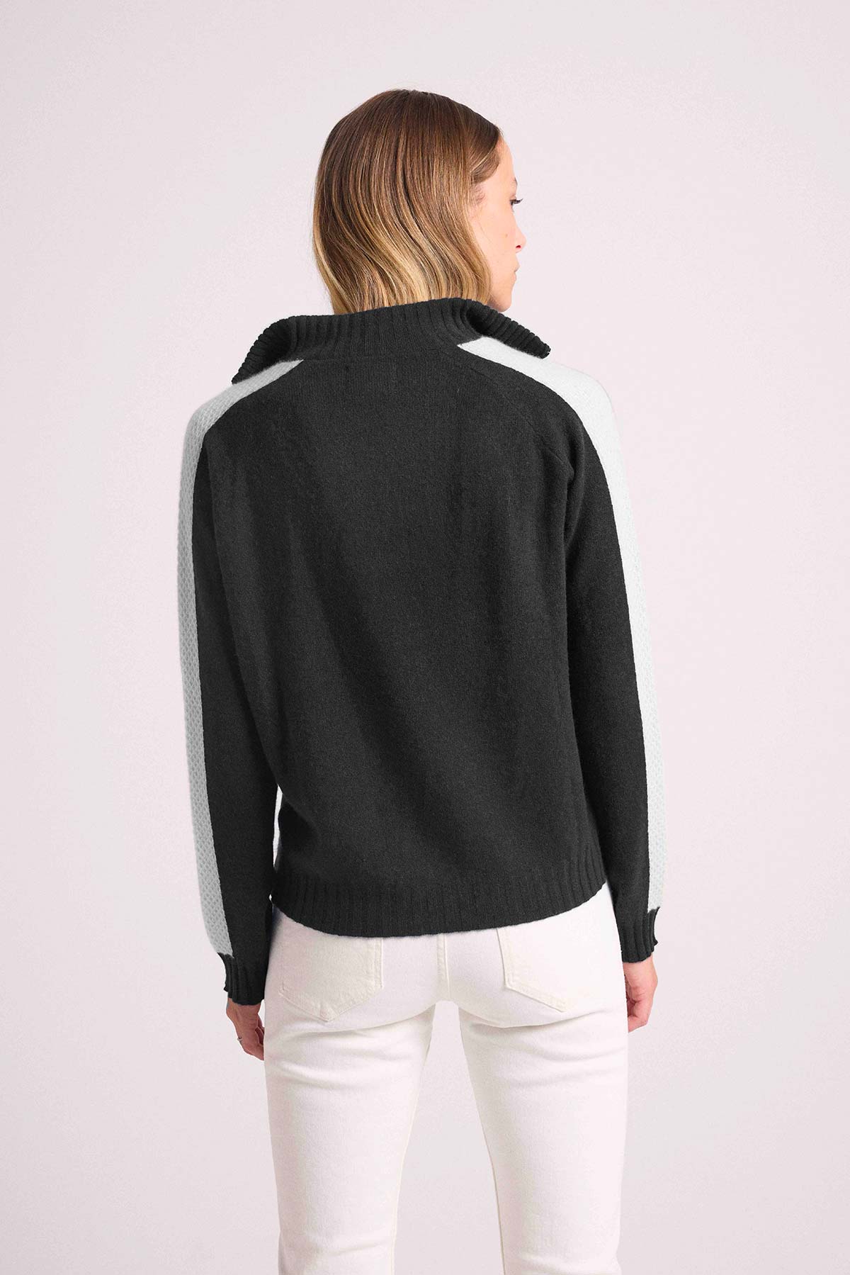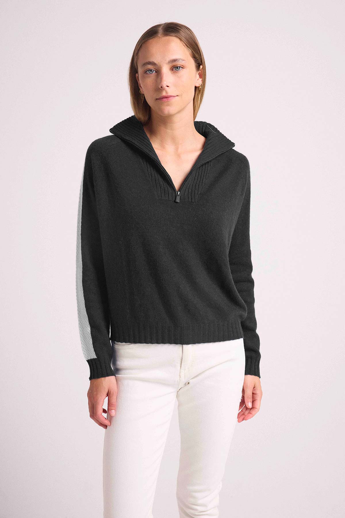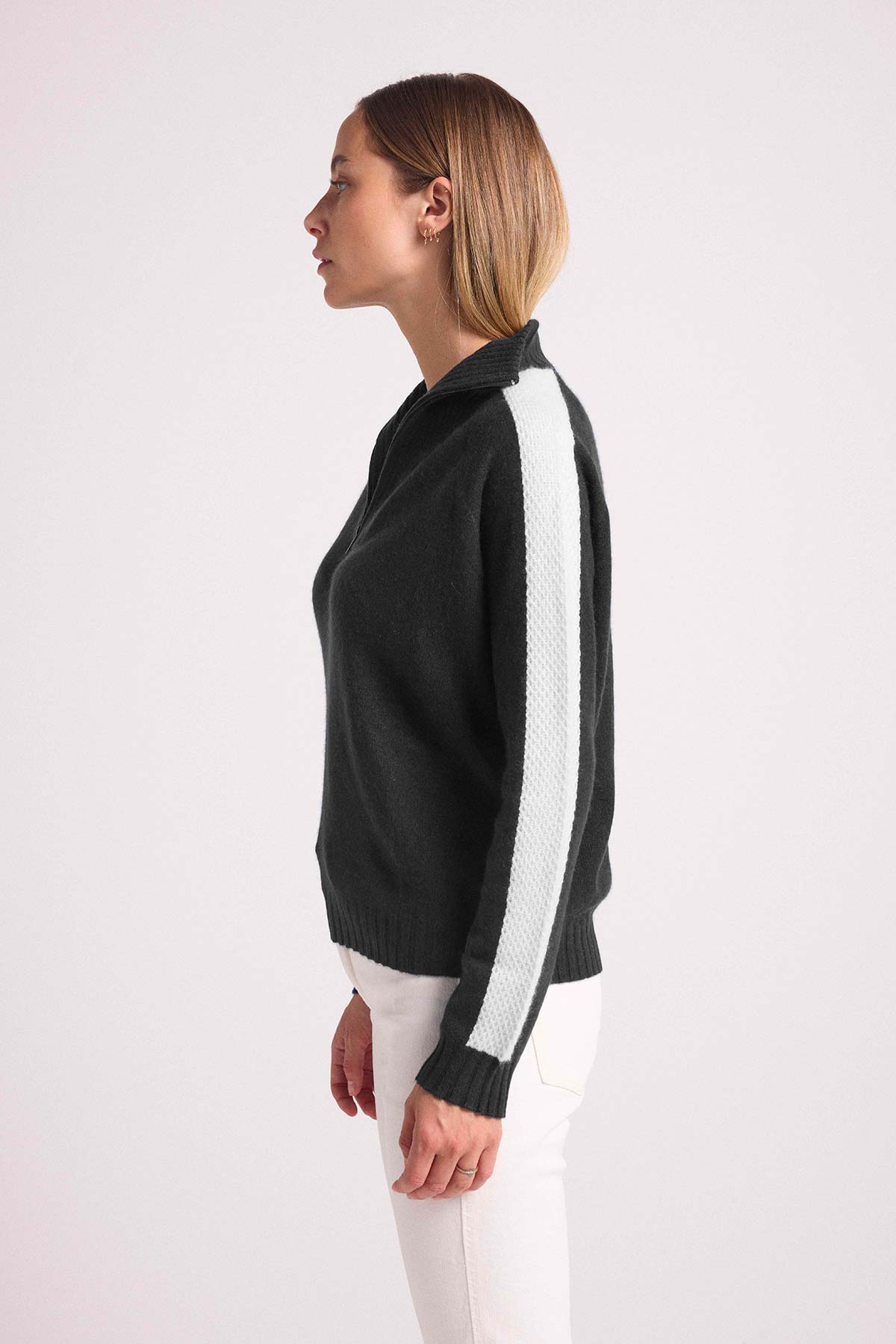 Illuminez votre vestiaire de saison avec ce pull 100% cachemire, muni d’un col camionneur zippé et montant, de manches longues et de bord côtelés. Il réchauffera votre silhouette avec des bandes en empiècements de points de mailles travaillés. Un jeu de contraste audacieux pour réchauffer vos looks de la saison. Autorisant tous les styles, il se portera autant sur un jean, une jupe, que sur un pantalon.