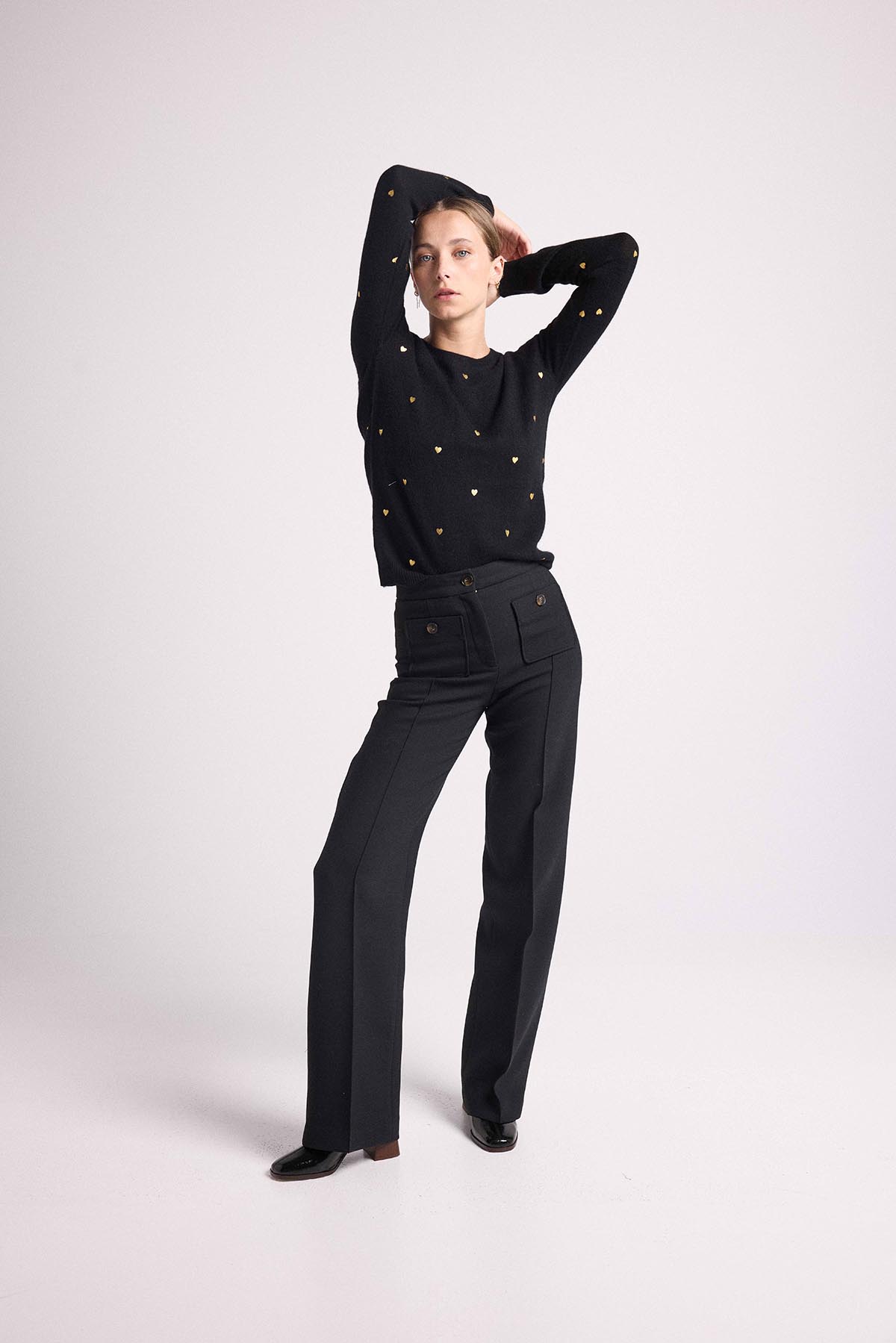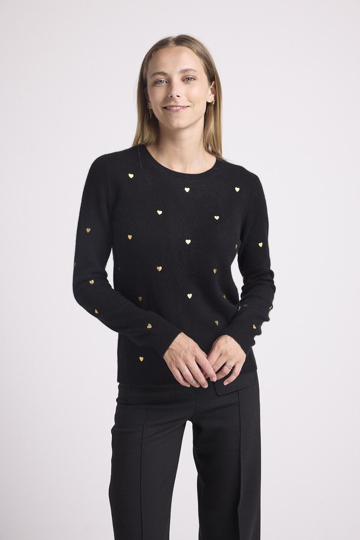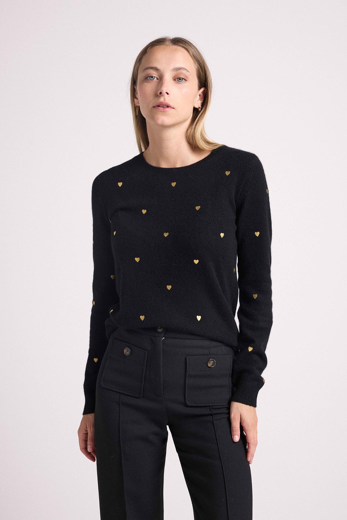 Venez vous « LOVER » dans un cachemire d’une infinie douceur avec notre pull Clémentine. Muni d’un col rond, de manches longues et de bords côtelés, il dévoile de petits coeurs dorés sur l’inégralité du pull, pour tous les amoureux de maison héritage. Adoptez un look chic et casual en le mixant à une chemise et un pantalon de tailleur structuré.