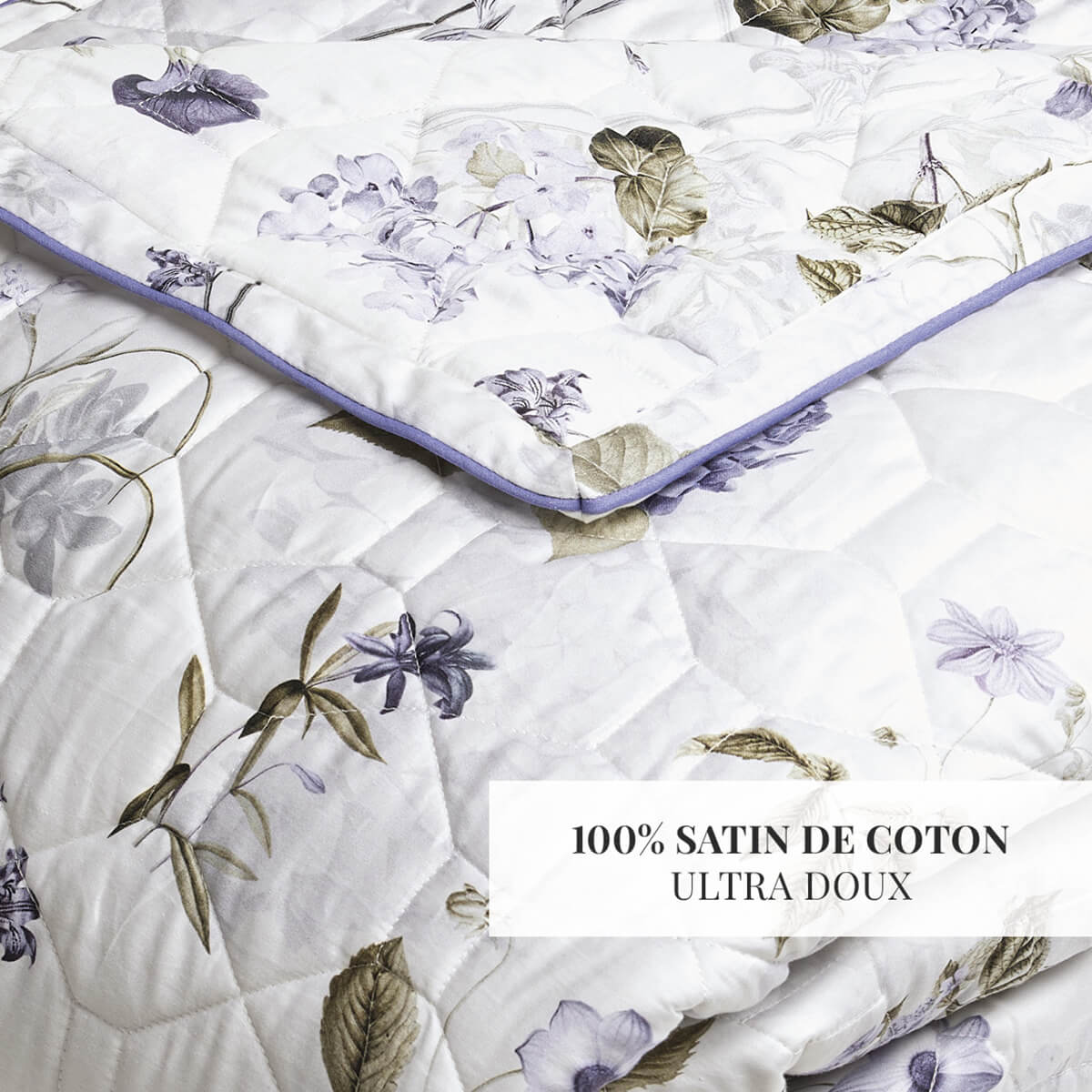 Couvre-lit en 100% satin de coton : dessin Hortensia – 180 x 220 cm 100% satin de coton – garnissage : 100% polyester