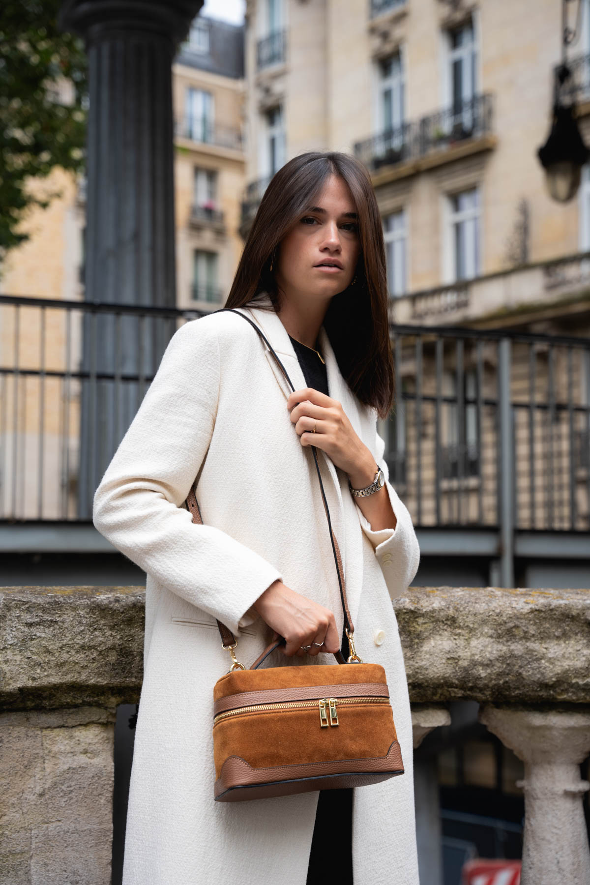 Sac à main en cuir sans poches supplémentaires, fermeture à glissière, poignée et bandoulière ajustable amovible.