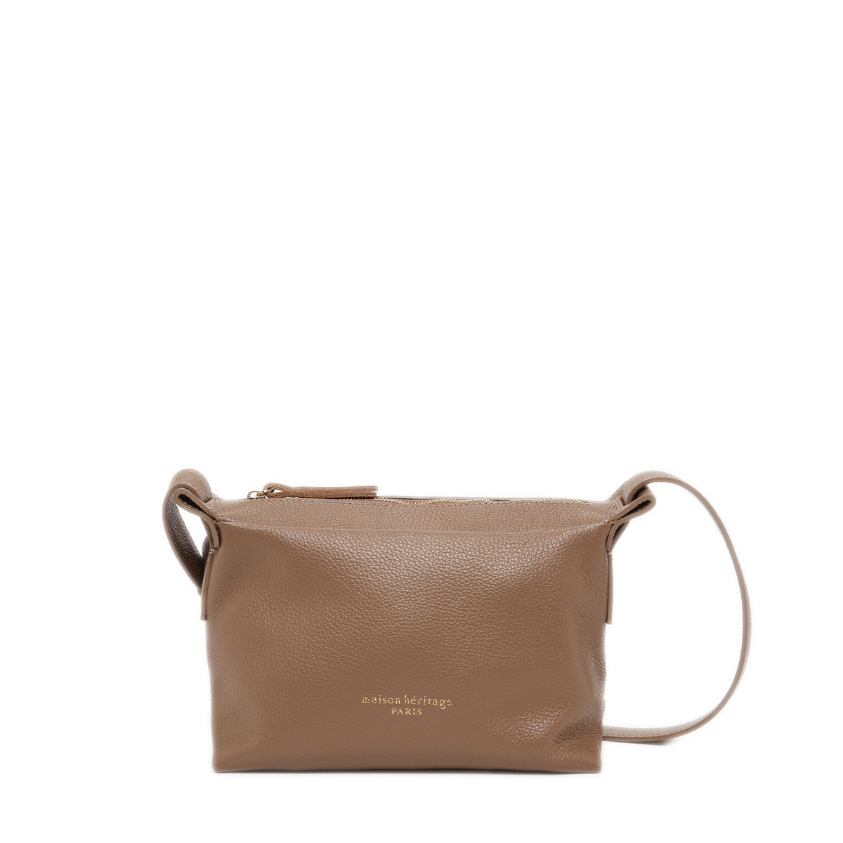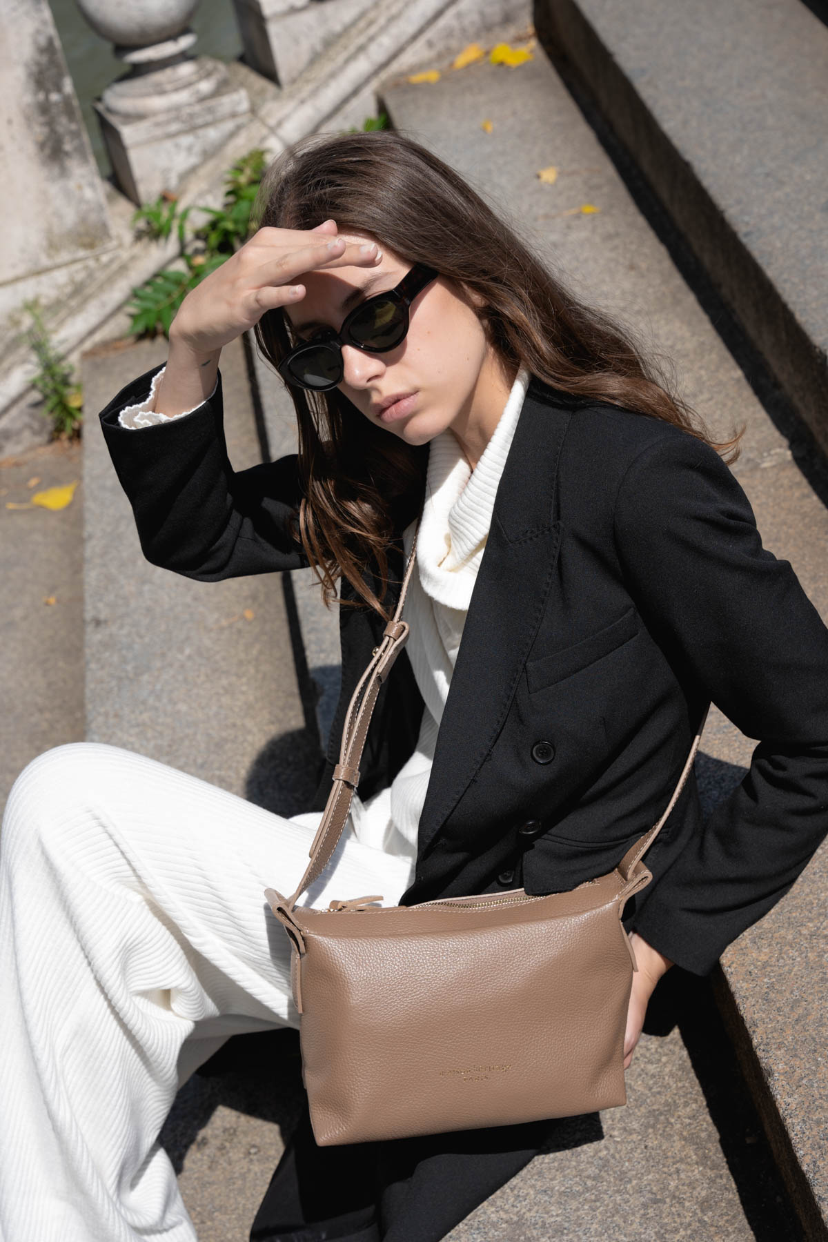 Sac en cuir avec poche intérieure zippée, fermeture à glissière, bandoulière réglable avec un bouton.