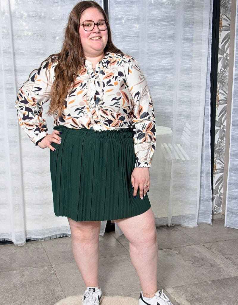 Laisse-toi séduire par le mouvement léger de cette jupe courte plissée verte.