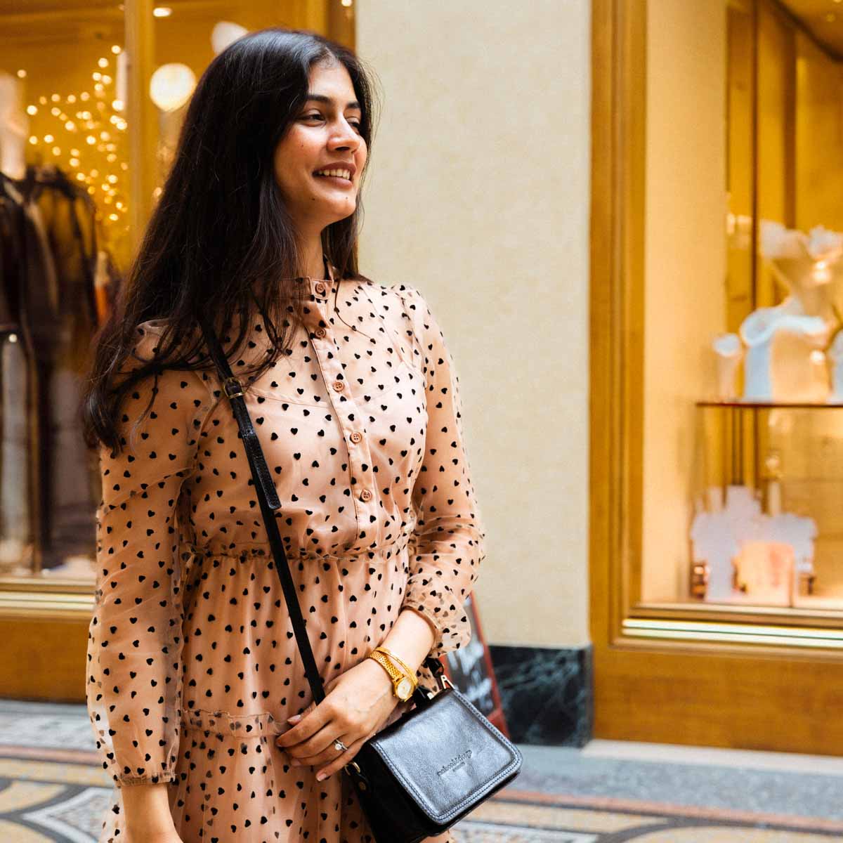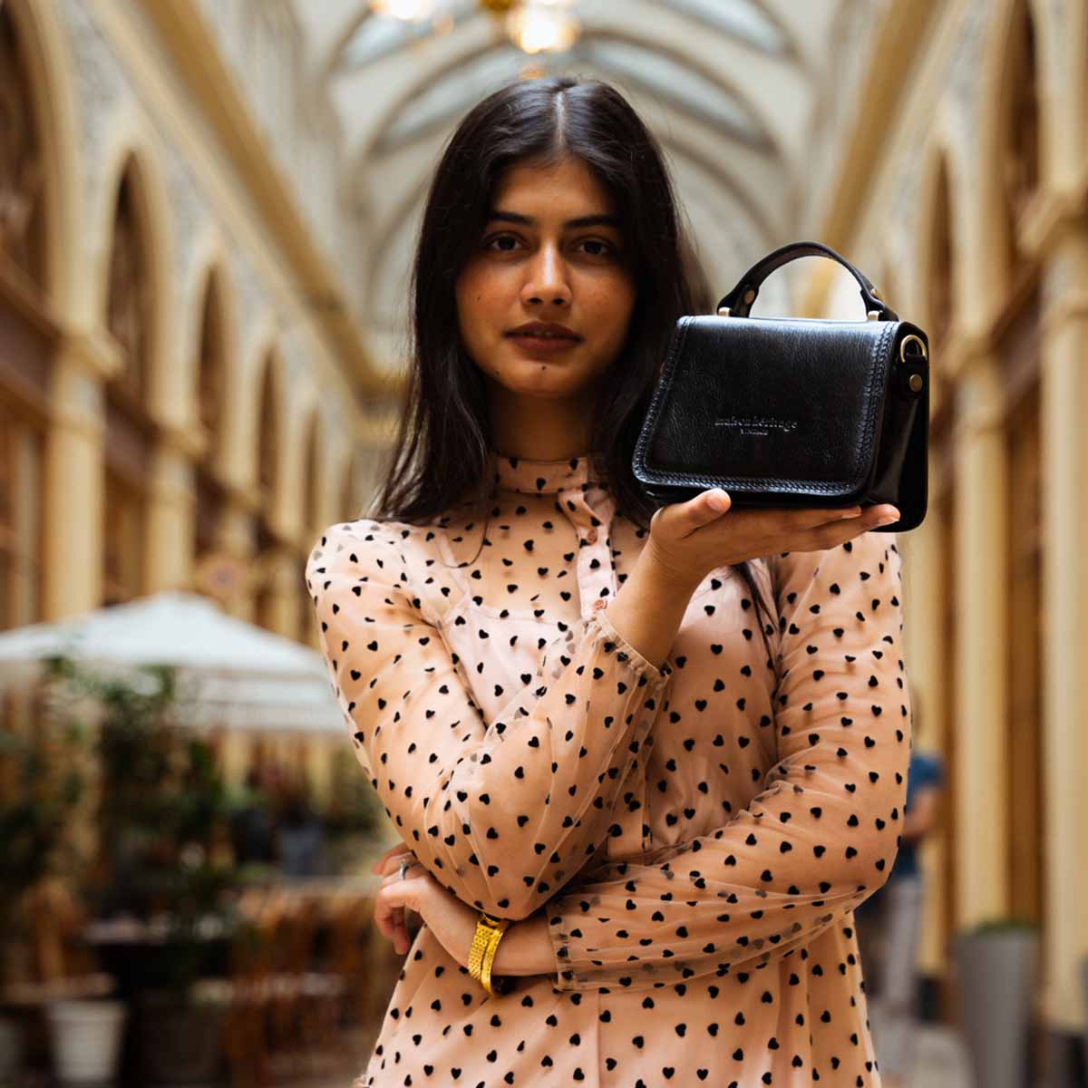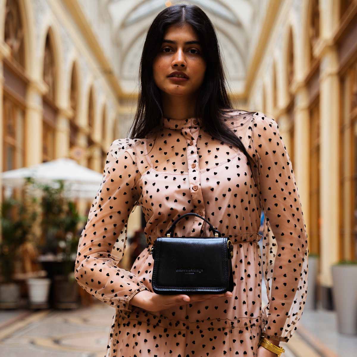 Sac à main en cuir avec une poche intérieure, fermeture magnétique et bandoulière amovible, ajustable en cuir.