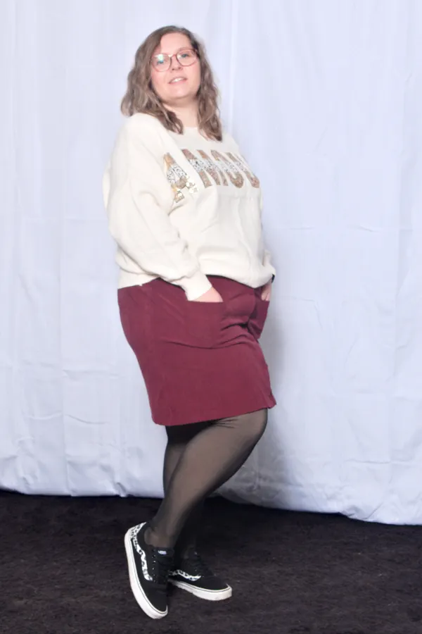 Amandine mesure 1,65 et porte une taille unique 44/52. Habituellement, elle porte du 50.
