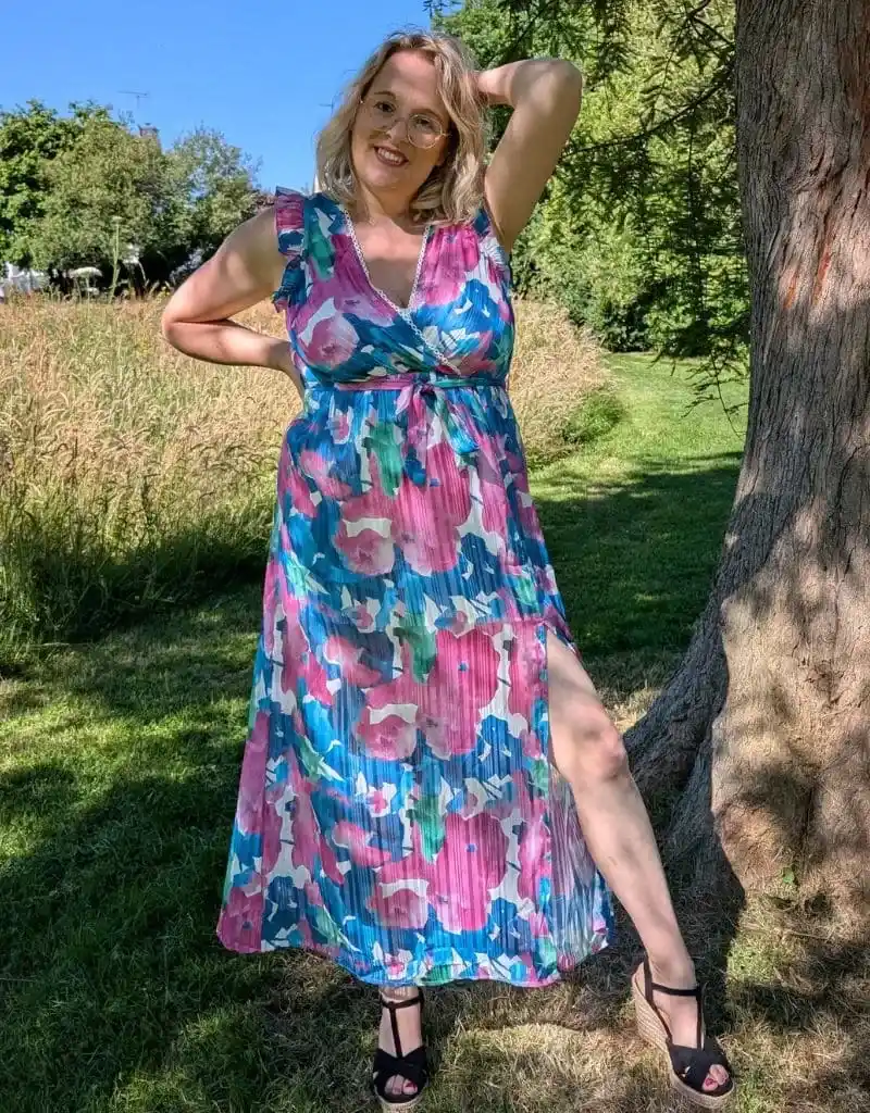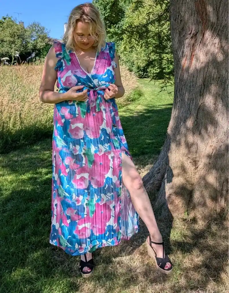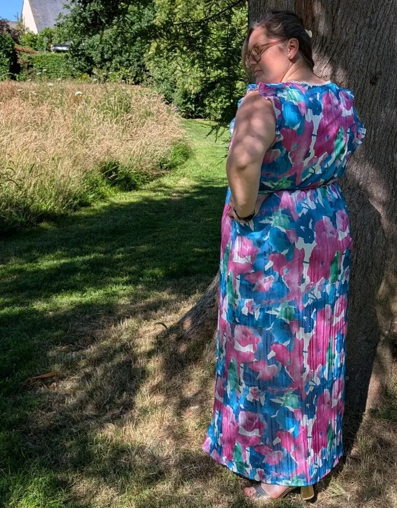 Fraîche, féminine, vibrante… Cette robe longue grande taille à imprimé fleuri multicolore est un rayon de soleil à elle seule 🌸Sa matière plissée fluide danse à chaque pas, tandis que sa fente délicate sur la jambe ajoute une touche subtilement glamour.