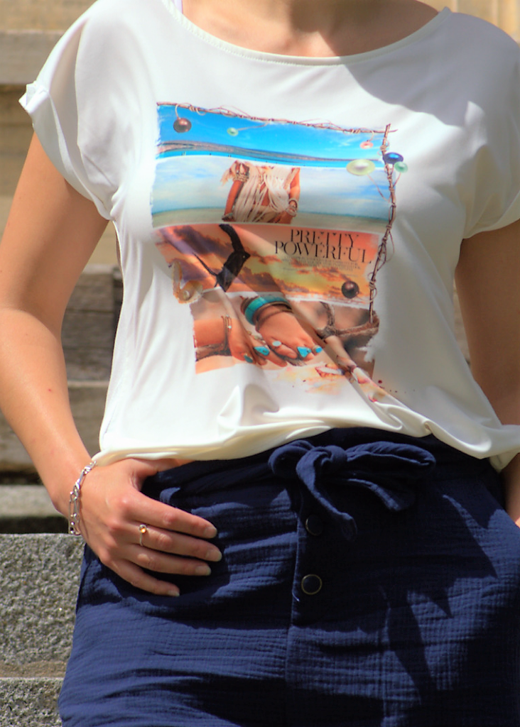 Le T-shirt qui te rendra joyeuse aussitôt enfilé. Ce sublime t-shirt agréable à porter pour les beaux jours. Ce vêtement sera parfait pour te rayonner au fil de ta journée. Sa coupe parfaite pour te mettre en valeurs. Et si facile à porter et à associer selon nos envies. Sa matière est douce au toucher et agréable à porter. Il est le t-shirt à avoir dans son dressing.